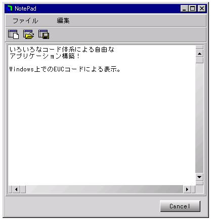 マルチエンコーディングWideStudioを使うと、プラットホーム間で異なるエンコーディングを気にする こと無くアプリケーションを開発することができます。WideStudioでは、ユニ コード(UTF8)、EUCJP、SJIS等のエンコーディング体系を利用することがで きます。WideStudio上ではプラットホーム毎のエンコーディングとは独立して各エンコー ディングを扱えるため、例えば、Linux上においてEUCJPで作成されたアプリケー ションが、EUCJPコードのまま Windows上で動作いたします。 LANG環境変数を指定することによって、オペレーティングシステムからのキー ボード入力のコードを特定し、WideStudio内で、自動的に変換を行います。ま た、外部のデータファイルの入出力において、自由にコード変換を行うことが できます。 ![]() [WideStudioのエンコーディングの扱い] ![]() [Windows 上での EUCJP コードでの表示の例] ![]() [ユニコードによる各国語の表示]