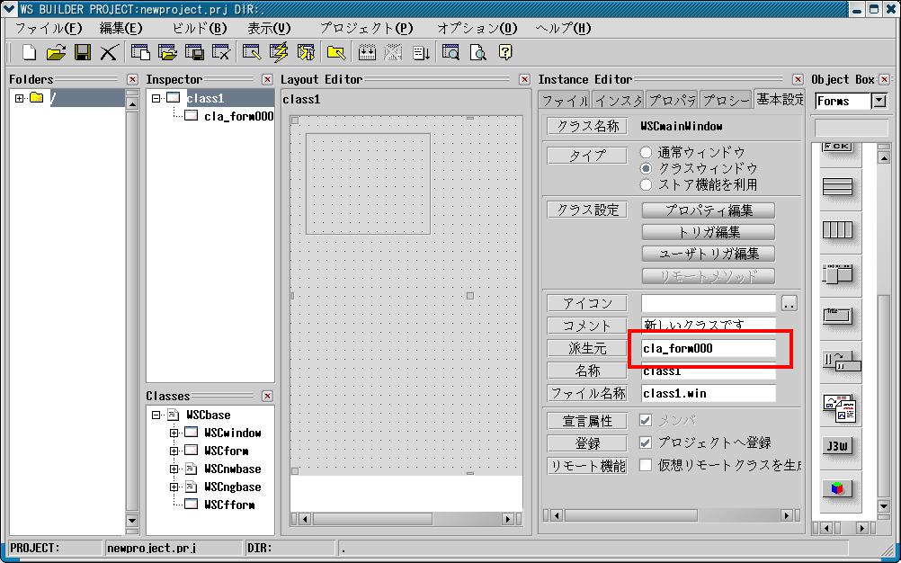 ![]() [ベースとなるオブジェクトの指定] 既存のオブジェクトを基に新しいクラスを派生するには既存のオブジェクト、例えばラベル(WSCvlabel)を基にあらたなラベルとして 部品にしたい場合、ベースとなるオブジェクトにそのラベルを指定します。ここでは、ラベル clavlab_000 をベースとしたクラスを作成しようとしています。 図の派生元に clavlab_000 を指定します。 (注意)派生元を変更した場合は、ソースプログラムを生成しなおす必要があります。 次に示すファイルがすでに存在する場合は削除してください。[classwin] はクラスウィンドウ名称です。